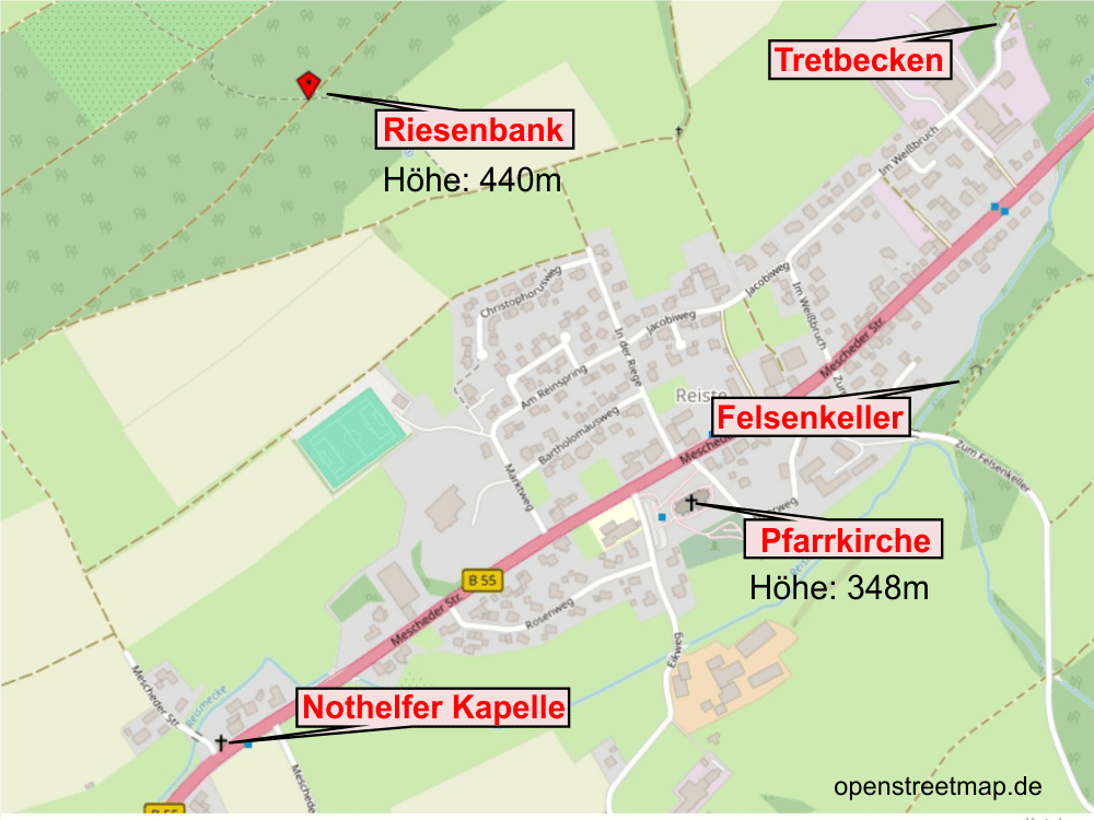 Von hier, oberhalb der Riesenbank, haben wir einen sehr schönen Ausblick auf den Esloher Ortsteil Reiste. In östlicher Richtung (links) liegen Hennesee und Meschede. Nach Westen (rechts) blickt man Richtung Eslohe und Olpe.